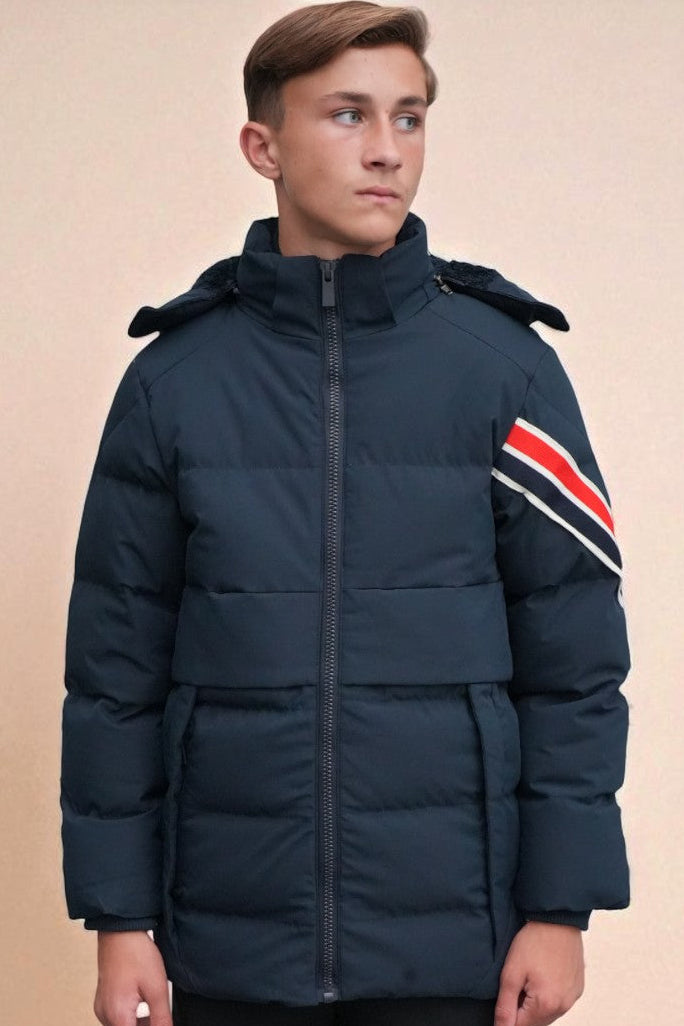 - Product Details: The jacket is identified as the "NEW 7-14 Years Stripe Long Line Jacket." No additional specifications or materials are provided in the given information.