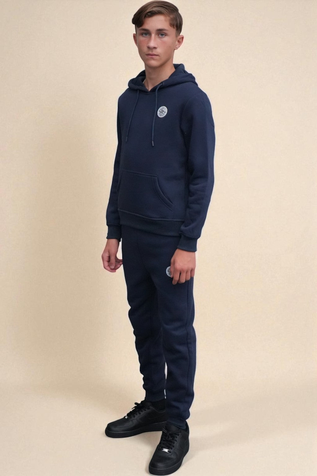 Theo Kids Tracksuit designed for ages 7-14 years. This tracksuit combines comfort and style with a cotton mix fabric. It features a warm pull-over hoodie, perfect for cooler days. The set includes two side zip pockets, adding functionality to the design. Ideal for everyday wear, this tracksuit is a practical choice for young user.